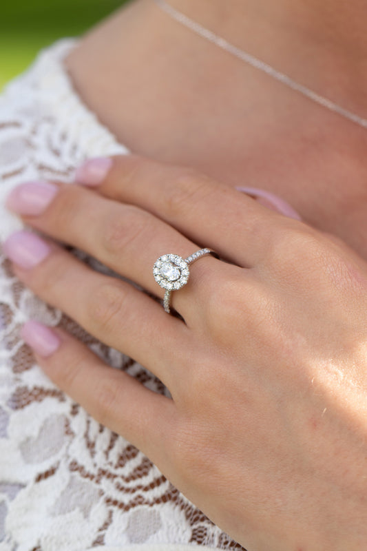 טבעת אירוסין בצורת יהלום אובל ומסביב יהלומים עגולים הלו 1 קראט בזהב לבן