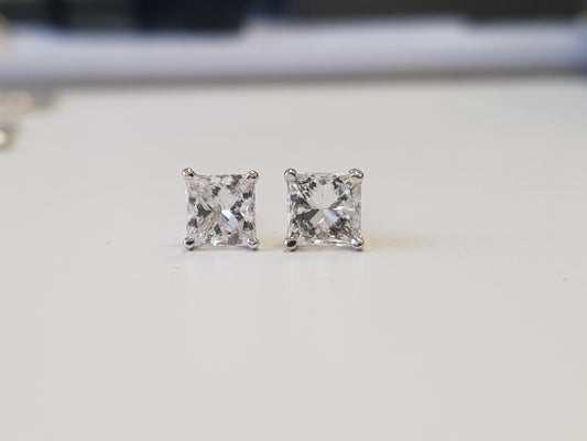 עגילי יהלומים בצורת פרינסס 1.47 קראט סהכ לזוג עגילים בזהב לבן 14 קראט